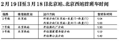 2號線、7號線、9號線2月19日至3月18日首班車時(shí)段加開;緩解北京站、北京西站返程客流壓力