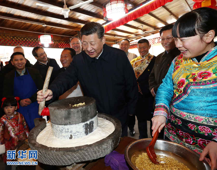 這是2月12日上午,習近平在阿壩藏族羌族自治州汶川縣映秀鎮(zhèn)考察時同居民群眾一起磨豆花。 新華社記者 鞠鵬 攝