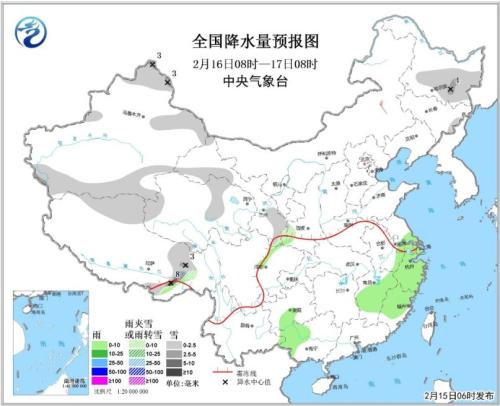全國降水量預(yù)報(bào)圖(2月15日08時-16日08時)