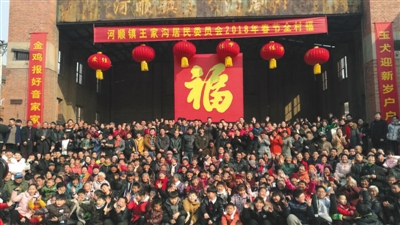 近四米見方的大紅“?!弊謶覓煸谖枧_中央,上面是寫有“河順鎮(zhèn)王家溝居民委員會2018年春節(jié)全村?!钡拇蠹t條幅。這樣喜慶的背景下面,是700多人笑逐顏開的臉。2月16日,大年初一,河南林州河順鎮(zhèn)王家溝村村民們拍了全村有史以來的第一張全村福。