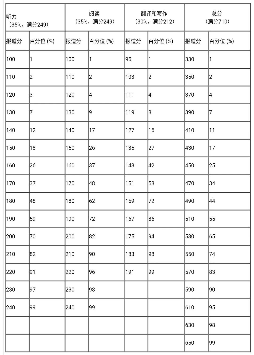 每次考試等值后的卷面分?jǐn)?shù)都參照常模轉(zhuǎn)換為報(bào)道分。四、六級考試報(bào)道總分為710分,計(jì)算公式為: