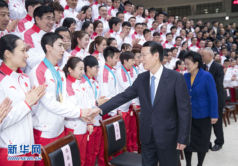 2月27日,國務(wù)院副總理、第24屆冬季奧林匹克運(yùn)動(dòng)會(huì)工作領(lǐng)導(dǎo)小組組長(zhǎng)張高麗在北京會(huì)見載譽(yù)歸來的平昌冬奧會(huì)中國體育代表團(tuán)。新華社記者王曄攝