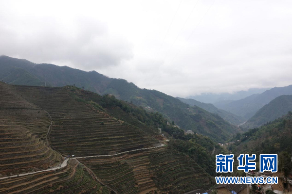 黃山市歙縣璜田鄉(xiāng)蜈蚣嶺村外蜿蜒的盤(pán)山公路與梯田。新華網(wǎng) 卓越 攝