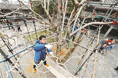 “為了修剪一棵樹而專門搭起腳手架,所做功夫之細,這在北京城里也是較為少見的?!鳖U和園古樹管護中心負責人韓紅巖說,其目的是盡最大努力保護古樹。如果用梯子,移動的時候容易把花苞碰掉,損壞枝條。樹冠深處的一些花苞也夠不著,存在修剪死角。頤和園采用搭腳手架這種獨有的修剪方式,所有問題也就迎刃而解了。