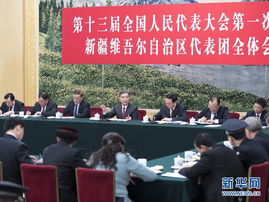 汪洋在新疆代表團(tuán)參加審議。在認(rèn)真聽取陳全國、雪克來提·扎克爾、孫金龍等代表發(fā)言后,汪洋說,十三屆全國人大一次會議第三次全體會議高票通過了憲法修正案,這是我國政治生活中一件具有里程碑意義的大事,新修改的憲法將為中華民族偉大復(fù)興提供有力憲法保障。完全贊同全國人大常委會工作報告。汪洋強調(diào),做好新時代新疆工作必須全面貫徹黨的十九大和十九屆二中、三中全會精神,以習(xí)近平新時代中國特色社會主義思想為指導(dǎo),緊緊圍繞社會穩(wěn)定和長治久安總目標(biāo),進(jìn)一步促進(jìn)各民族交往交流交融,增強中華民族共同體意識,堅決維護(hù)社會和諧穩(wěn)定,充分發(fā)揮兵團(tuán)在穩(wěn)疆建疆中的重要作用,努力建設(shè)團(tuán)結(jié)和諧、繁榮富裕、文明進(jìn)步、安居樂業(yè)的中國特色社會主義新疆。