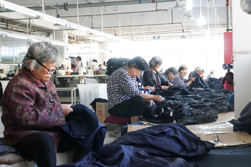 河南沈丘縣永盛服飾有限公司車(chē)間內(nèi),在家閑不住的老人們到車(chē)間打零工,掙點(diǎn)零花錢(qián) 王林園 攝