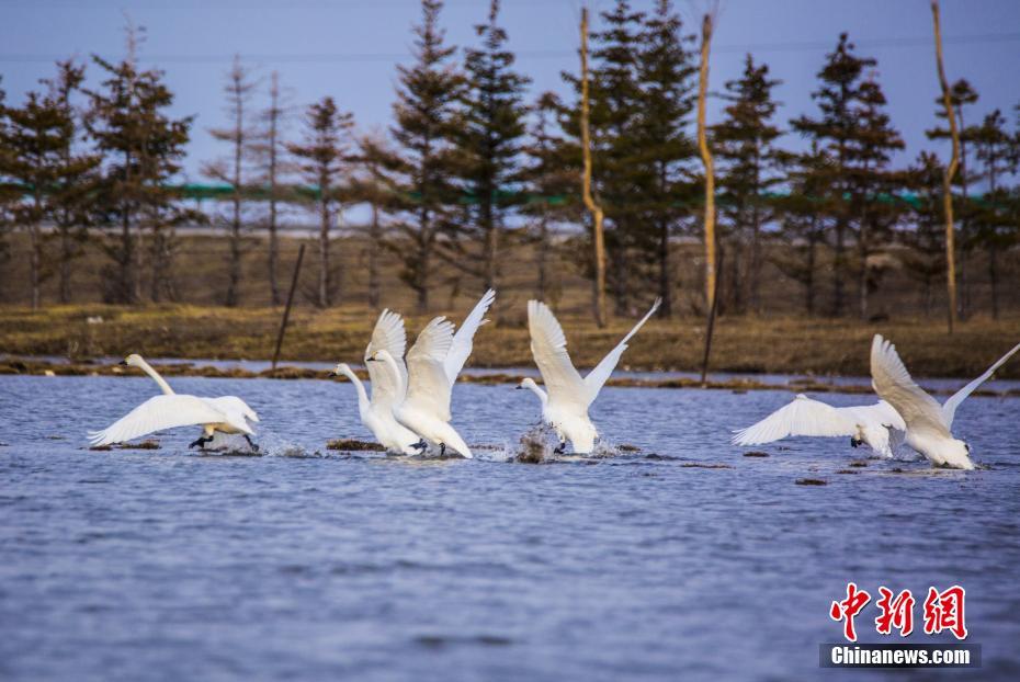 3月20日,天鵝在湖面上“舞蹈”。日前,內(nèi)蒙古自治區(qū)呼倫貝爾市陳巴爾虎旗陸續(xù)迎來大量北歸天鵝。據(jù)了解,每年四月份,成群的天鵝從中國(guó)南方遷徙到呼倫貝爾產(chǎn)卵繁殖,而今年三月中旬起,陳巴爾虎旗境內(nèi)便迎來大量回歸天鵝,實(shí)屬罕見。中新社記者 武軍 攝