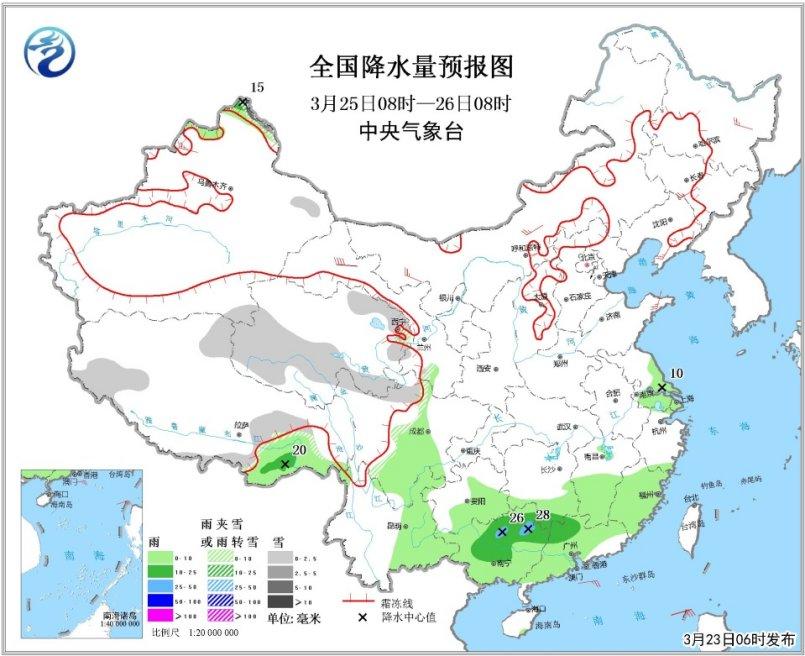 3月25日08時至26日08時,新疆北部山區(qū)、西藏西南部、青海東北部及南部、川西高原北部等地的部分地區(qū)有小到中雪或雨夾雪,其中新疆北部山區(qū)局地有大到暴雪;西藏東南部、四川盆地南部、云南東部、貴州東南部、江蘇東南部、江南南部及東北部、華南大部等地有小到中雨,其中廣西北部部分地區(qū)有大雨,上述局地并將伴有短時強降水等強對流天氣。內(nèi)蒙古中西部、甘肅西部、東北地區(qū)南部、山東半島等地有4~6級風(fēng)。