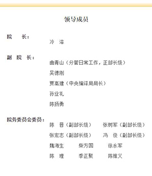 此外,擔任副院長的有曲青山(分管日常工作,正部長級)、吳德剛、賈高建(中央編譯局局長)、孫業(yè)禮、陳揚勇,院務委員會委員分別有陳晉(副部長級)、張樹軍(副部長級)、張宏志(副部長級)、馮俊(副部長級)、魏海生、柴方國、徐永軍、陳理、季正聚、陳維義。