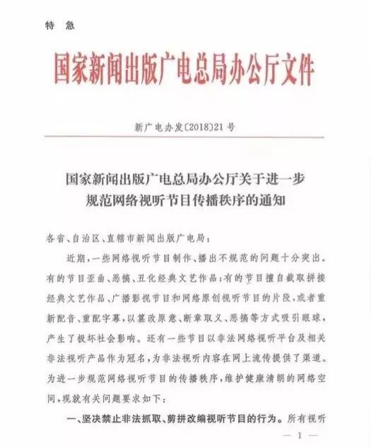 3月22日,國(guó)家廣電總局發(fā)布《關(guān)于進(jìn)一步規(guī)范網(wǎng)絡(luò)視聽(tīng)節(jié)目傳播秩序的通知》。