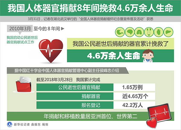 新華社武漢4月1日電(記者馮國棟)記者31日在湖北武漢舉行的“全國人體器官捐獻(xiàn)緬懷紀(jì)念暨宣傳普及活動(dòng)”獲悉,2010年3月我國啟動(dòng)公民逝世后器官捐獻(xiàn)試點(diǎn)工作至今的8年間,我國公民逝世后捐獻(xiàn)的器官累計(jì)挽救了4.6萬余人生命。