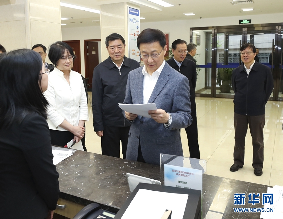 4月3日,中共中央政治局常委、國務(wù)院副總理韓正到國家發(fā)展改革委調(diào)研并主持召開座談會。這是韓正在國家發(fā)展改革委政務(wù)服務(wù)大廳考察。新華社記者 龐興雷 攝