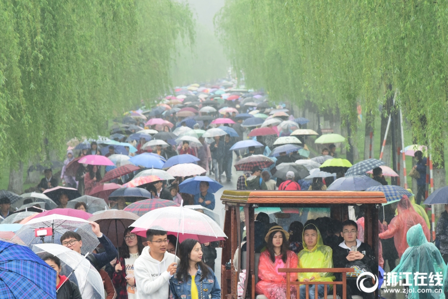 4月5日,清明小長(zhǎng)假首日,杭州細(xì)雨綿綿,西湖景區(qū)游客絡(luò)繹不絕。杭城雖降雨降溫,但西湖景區(qū)前來賞花踏青的游客如潮,斷橋似人橋。(浙江在線拍友 里爾 柱子 攝)