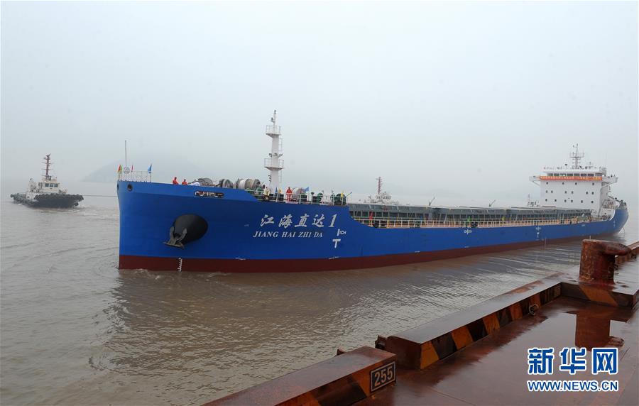 4月5日下午,“江海直達(dá)1”號在拖船的協(xié)助下駛離浙江省舟山市鼠浪湖礦石中轉(zhuǎn)碼頭,首航安徽馬鞍山。新華社發(fā)(吳琳紅 攝)