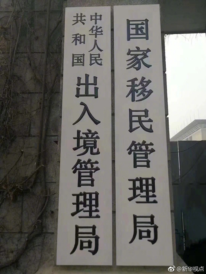 4月2日,新組建的國(guó)家移民管理局正式掛牌。國(guó)家移民管理局將公安部的出入境管理、邊防檢查職責(zé)整合,建立健全簽證管理協(xié)調(diào)機(jī)制,加掛中華人民共和國(guó)出入境管理局牌子,由公安部管理。(新華社“新華視點(diǎn)”微博 記者 劉奕湛)