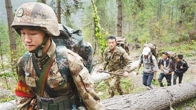 察隅邊防官兵與當(dāng)?shù)鼐用窠M成巡邏隊(duì)進(jìn)山巡邏。 記者 鄧建勝攝