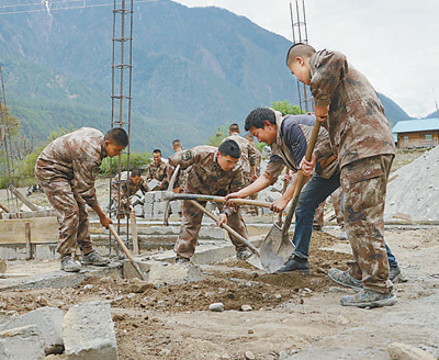 上察隅鎮(zhèn)松林村藏族同胞玖五家建房缺幫手,邊防官兵主動(dòng)前往幫忙。 記者 鄧建勝攝