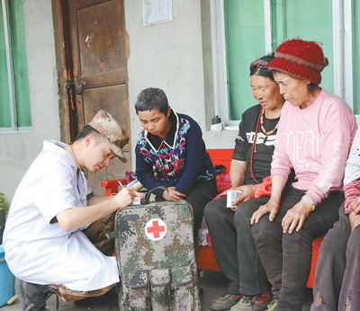 邊境村遠(yuǎn)離城鎮(zhèn),邊防官兵每月都要組織衛(wèi)生員到村里巡診。圖為4月10日,連隊(duì)醫(yī)生陽(yáng)運(yùn)川來(lái)到次旺卓瑪(戴項(xiàng)鏈者)家義診。 記者 鄧建勝攝