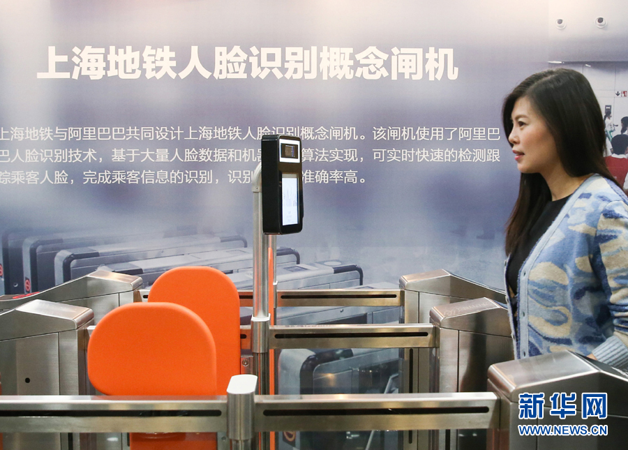 在上海申通地鐵集團(tuán)有限公司,工作人員在現(xiàn)場體驗刷臉進(jìn)站技術(shù)(2017年12月5日攝)。新華社記者 丁汀 攝