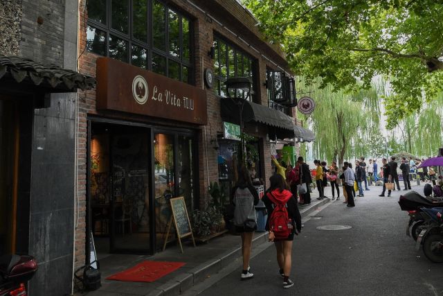 游客從“初心”咖啡館的門前經(jīng)過。靠近杭州南山路的“初心”咖啡館以前是“東籬會所”,如今成了別有風味的大眾咖啡館。新華社記者 黃宗治 攝
