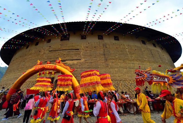 人們在福建省華安縣仙都鎮(zhèn)大地土樓群的“土樓之王”——二宜樓里舉行“三月三”民俗文化活動。 新華社記者 魏培全 攝