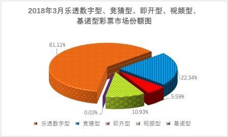 3月份,樂透數字型彩票銷售245.59億元,同比增加1.12億元,增長0.5%;競猜型彩票銷售89.79億元,同比增加22.10億元,增長32.7%;即開型彩票銷售22.45億元,同比減少1.65億元,下降6.8%;視頻型彩票銷售43.92億元,同比增加1.02億元,增長2.4%;基諾型彩票銷售0.12億元,同比減少0.06億元,下降31.6%。3月份,樂透數字型、競猜型、即開型、視頻型、基諾型彩票銷售量分別占彩票銷售總量的61.11%、22.34%、5.59%、10.93%、0.03%。