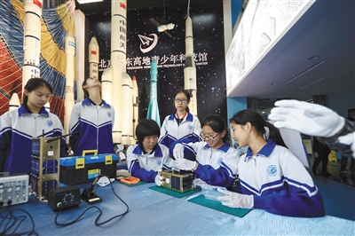 昨日,北京市東高地青少年科技館,學生在練習拆裝1:1衛(wèi)星模型。新京報記者 王嘉寧 攝