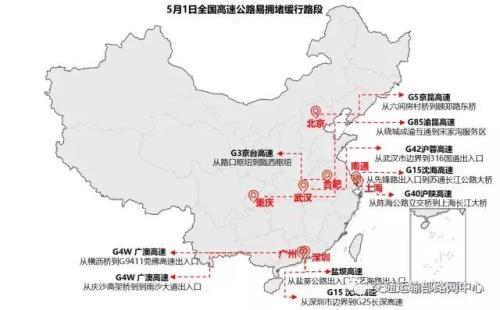 5月1日,全國高速路易擁堵緩行路段。來自交通部路網中心微信公號。