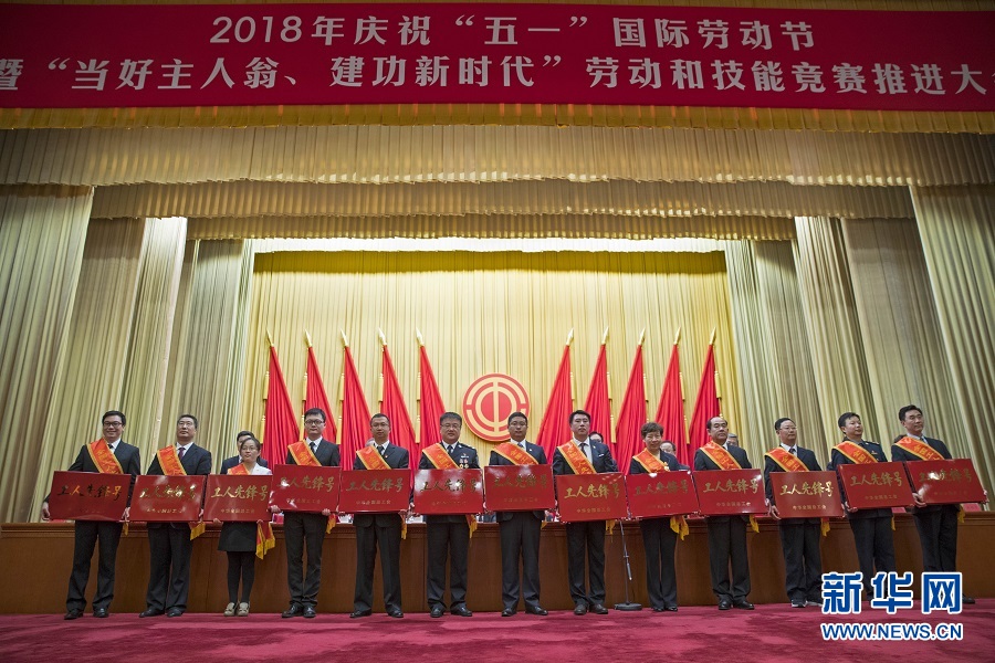 4月28日,榮獲全國工人先鋒號的部分集體代表在大會上合影。當(dāng)日,2018年慶?!拔逡弧眹H勞動節(jié)暨“當(dāng)好主人翁、建功新時代”勞動和技能競賽推進(jìn)大會在北京人民大會堂舉行。 新華社記者 才揚(yáng) 攝