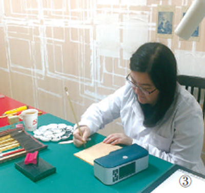 無(wú)影燈下,大大小小的毛筆、毛刷整齊排列,調(diào)色盤中墨色深淺不一,一臺(tái)小型分色測(cè)試儀隨時(shí)“待命”;桌上有根據(jù)文物原件打印出來(lái)的精細(xì)放大圖像和色彩分析數(shù)據(jù);右手邊是帶有通風(fēng)裝置的操作臺(tái);房間盡頭處有帶過(guò)濾架的水槽,專供清洗印染后的紙張……