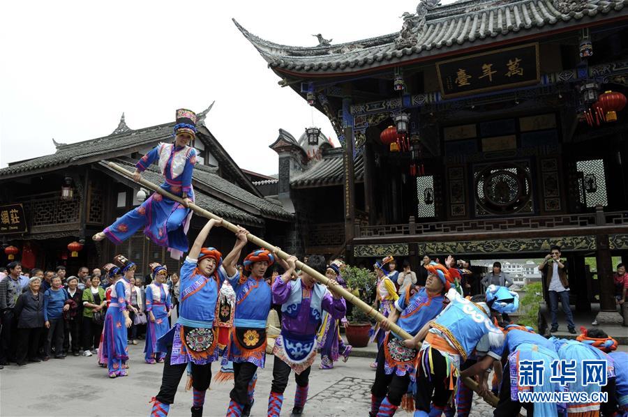 演員在汶川縣水磨鎮(zhèn)萬年臺(tái)進(jìn)行民俗表演(2012年5月23日攝)。新華社發(fā)(王飛 攝)