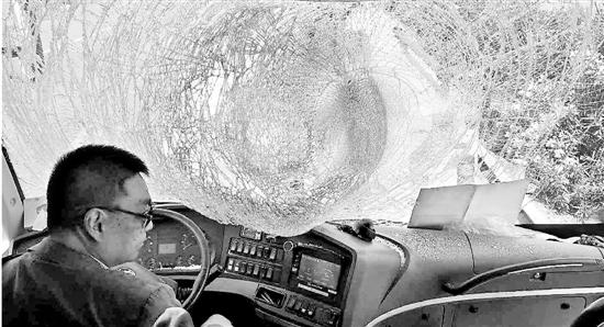 毫無征兆,一只輪胎突然飛來。只聽“砰”的一聲,大巴車的擋風(fēng)玻璃瞬間碎成蛛網(wǎng)狀,玻璃殘?jiān)w濺到駕駛員劉師傅和前排乘客身上。一兩秒鐘的時(shí)間,駕駛員的臉上、脖子受傷,全是血渣子。