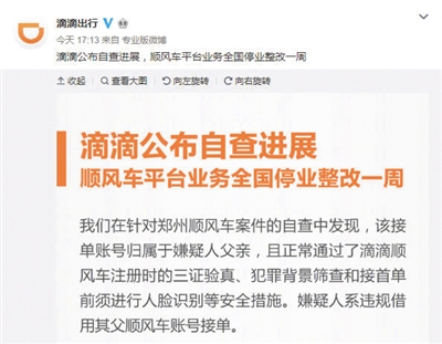 同日,滴滴公布鄭州順風(fēng)車案自查進(jìn)展,順風(fēng)車平臺(tái)業(yè)務(wù)全國停業(yè)整改一周。