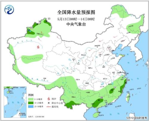 5月12日08時(shí)至13日08時(shí),華北東部、江南北部和西南部、華南西部和南部、貴州東南部、云南南部等地有中到大雨,其中,云南南部、廣西北部和南部局地有暴雨,廣西東部、廣東西南部等地有分散性暴雨或大暴雨,上述局部地區(qū)將伴有雷暴大風(fēng)、短時(shí)強(qiáng)降水等強(qiáng)對流天氣,其中,河北中南部、北京、天津、山西東部、山東北部等地局地將有雷暴大風(fēng)或冰雹天氣。東北地區(qū)南部和北部、華北西部、西北地區(qū)東北部、內(nèi)蒙古、新疆北部等地的部分地區(qū)有4~6級風(fēng),新疆南疆盆地、內(nèi)蒙古中西部局地有揚(yáng)沙或浮塵(見圖1)。