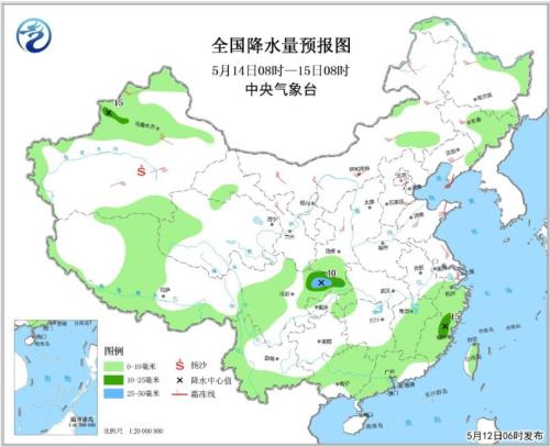 5月14日08時(shí)至15日08時(shí),東北地區(qū)東部、江南中東部、華南大部、新疆北部、四川大部、云南西部和南部、西藏中部等地有小到中雨,其中,四川盆地北部局地有大雨。東北地區(qū)、華北南部、黃淮東部、江淮東部、西北地區(qū)東北部、內(nèi)蒙古、新疆北部和南疆盆地等地的部分地區(qū)有4~6級風(fēng),新疆南疆盆地局地有揚(yáng)沙或浮塵(見圖3)。