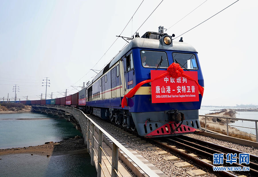 發(fā)往比利時(shí)安特衛(wèi)普的國(guó)際集裝箱班列從河北唐山港京唐港區(qū)駛出(4月26日攝)。唐山港京唐港區(qū)當(dāng)日正式開通中歐國(guó)際集裝箱班列。新華社記者 楊世堯 攝