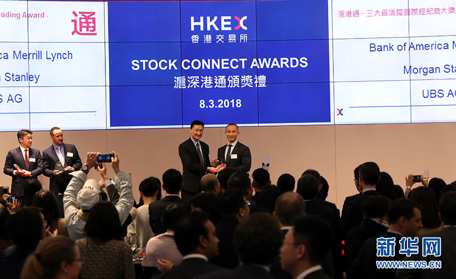 香港交易所舉辦2017年度“滬深港通”頒獎(jiǎng)禮,表?yè)P(yáng)主要經(jīng)紀(jì)商于2017年參與“滬深港通”互聯(lián)互通股票交易機(jī)制所取得的成績(jī)(3月8日攝)。新華社記者 李鵬 攝