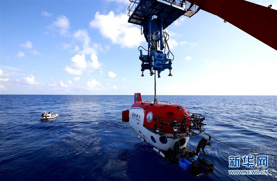 “深海勇士”號從科考母船“探索一號”入海(5月21日攝)。新華社記者 張建松 攝