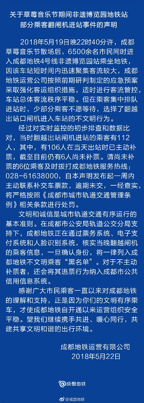 5月22日,成都地鐵發(fā)布“關(guān)于草莓音樂節(jié)期間非遺博覽園地鐵站部分乘客翻閘機(jī)進(jìn)站事件的聲明”(以下簡(jiǎn)稱“聲明”),稱,5月19日晚草莓音樂節(jié)散場(chǎng)后翻越地鐵4號(hào)線非遺博覽園站出站閘機(jī)進(jìn)站的乘客112人中,尚有6人尚未補(bǔ)票。“聲明”發(fā)布起一周內(nèi),希望他們主動(dòng)聯(lián)系補(bǔ)交車票款,逾期未交,一經(jīng)查實(shí),將嚴(yán)格按照《成都市城市軌道交通管理?xiàng)l例》相關(guān)條款進(jìn)行處罰。