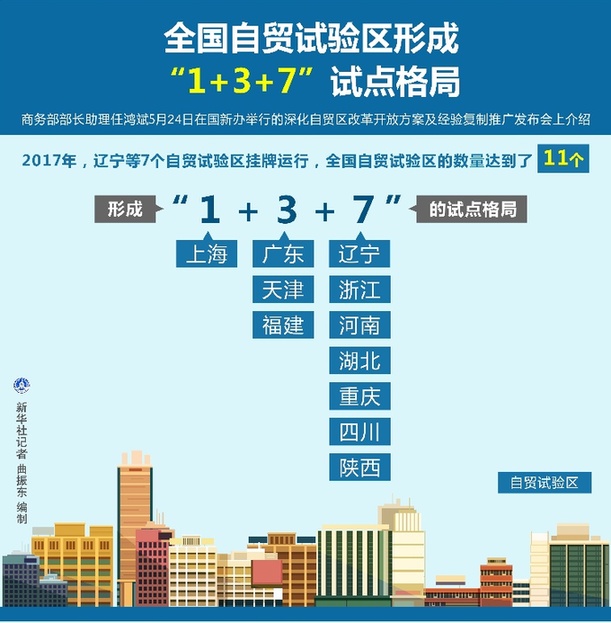 新華社北京5月24日電(記者郁瓊源)商務(wù)部部長助理任鴻斌5月24日在國新辦舉行的深化自貿(mào)區(qū)改革開放方案及經(jīng)驗(yàn)復(fù)制推廣發(fā)布會上介紹,2017年,遼寧等7個(gè)自貿(mào)試驗(yàn)區(qū)掛牌運(yùn)行,全國自貿(mào)試驗(yàn)區(qū)的數(shù)量達(dá)到了11個(gè),形成“1+3+7”的試點(diǎn)格局。