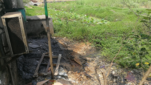 一家縣城周邊的農(nóng)莊,餐廚污水、廢棄物長(zhǎng)時(shí)間排放到一個(gè)小水塘,堆滿了黑色或黃色的濕乎乎、粘稠狀污物,旁邊緊鄰著稻田和一條灌溉水渠。記者 白田田 攝