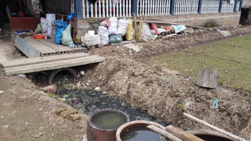 一個(gè)主打“土雞土菜”的農(nóng)家樂(lè),餐廚廢水直接排到屋后的水渠,長(zhǎng)年累月形成了黑色油膩的泥垢。記者 白田田 攝