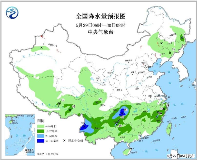 5月29日08時至30日08時,西藏、西南地區(qū)大部、江南、華南大部、黑龍江東部、吉林、遼寧中北部、內蒙古東部等地有小到中雨,其中,云南西部、貴州中東部、重慶東南部、湖南西部等地的部分地區(qū)有大雨或暴雨(50~90毫米)。上述部分地區(qū)有短時強降水、雷暴大風等強對流天氣。新疆中北部、內蒙古東部、東北地區(qū)西部等地的部分地區(qū)有4~6級風,北疆山口地區(qū)風力可達8~9級。黃海東北部海域、黃海西南部和東南部的部分海域將有大霧,能見度不足1公里。