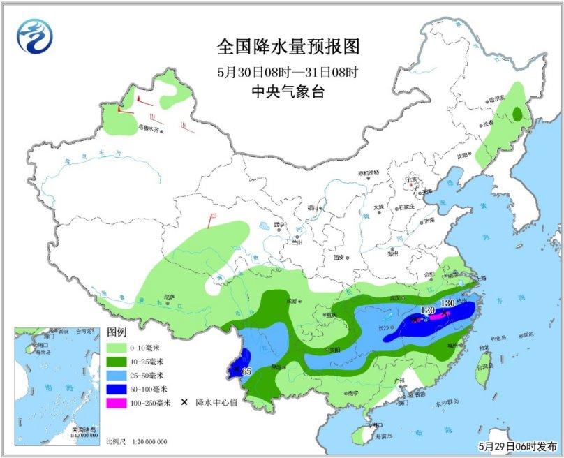 5月30日08時至31日08時,江南大部、江漢南部、華南西北部、西南地區(qū)東部和南部、川西高原南部等地有中到大雨,其中江南中北部和云南西部等地的部分地區(qū)有暴雨,局地大暴雨(100~130毫米)。上述部分地區(qū)有短時強降水、雷暴大風等強對流天氣。新疆北部和青海西北部等地部分地區(qū)有4~6級風,北疆山口地區(qū)風力可達8~10級。