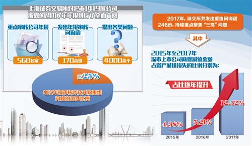 隨著上市公司年報(bào)披露季結(jié)束,證券交易所對公司的年報(bào)審核也隨之進(jìn)入高峰。目前,審核工作基本完成。上海證券交易所全面審閱了滬市1419家公司披露的2017年年報(bào),重點(diǎn)審核了560多家公司年報(bào),發(fā)出年報(bào)審核問詢函170余份,提出各類問題4000余個(gè),全部審核問詢函均對外公開。值得關(guān)注的是,“三高”(高估值、高商譽(yù)、高業(yè)績)并購后遺癥十分明顯。