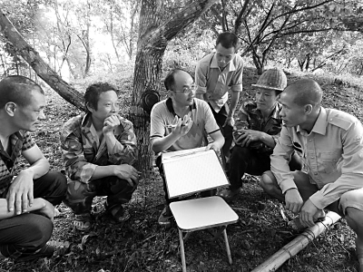 科技特派員高允旺(左三)在田間為農(nóng)民指導(dǎo)竹蓀栽培技術(shù)。資料圖片
