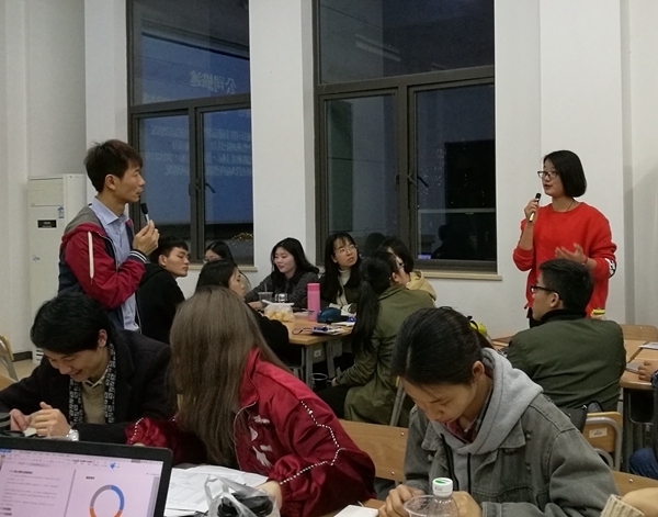 圖為2018年3月,李儒欽(左站立者)在福州和兩岸青年做青年創(chuàng)業(yè)分享課。