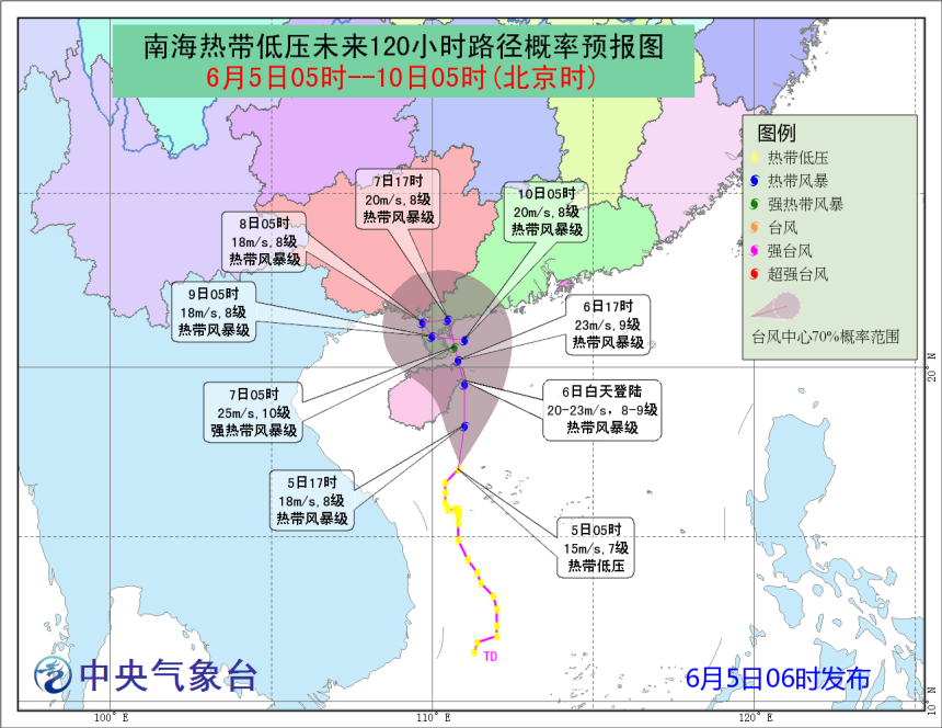 許映龍:南海的熱帶低壓于6月5日8時加強(qiáng)為今年第4號臺風(fēng)。5日16時,第4號臺風(fēng)的中心位于海南省文昌市東偏南方向約85公里的海面上,中心附近最大風(fēng)力有8級(18米/秒)。目前,第4號臺風(fēng)以每小時20公里左右的速度向北偏西方向移動,并逐漸向我國海南東南部沿海靠近,并將于5日夜間至6日上午擦過或登陸海南東北部沿海(熱帶風(fēng)暴級,20-23米/秒,8-9級),6日下午至7日早晨登陸廣東西部沿海(熱帶風(fēng)暴-強(qiáng)熱帶風(fēng)暴級,20-25米/秒,8-10級)。