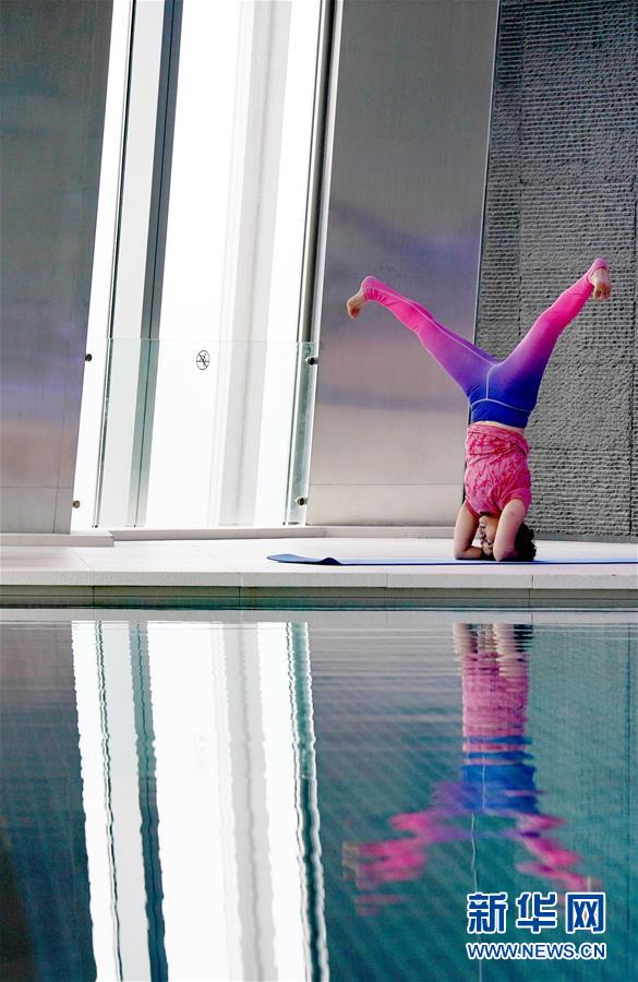 6月9日,在北京國貿(mào)大酒店78層游泳館,瑜伽愛好者練習瑜伽。