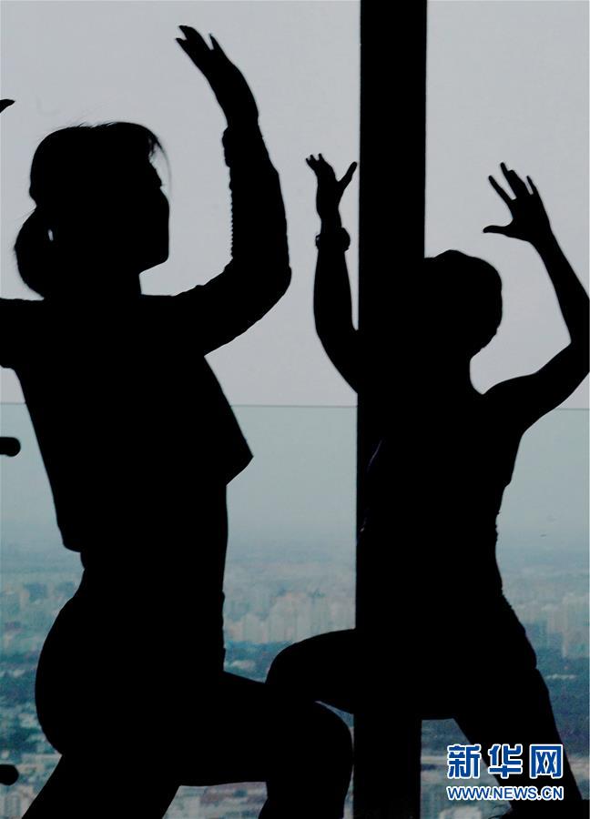 當(dāng)日,數(shù)名瑜伽愛好者在專業(yè)瑜伽教練的帶領(lǐng)下在北京國貿(mào)大酒店70層以上的高樓層練習(xí)瑜伽,體驗(yàn)高空練習(xí)瑜伽的樂趣。